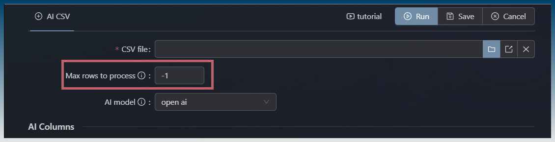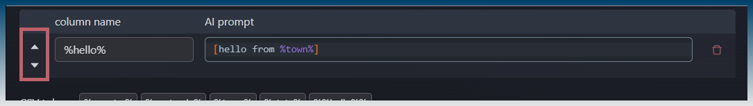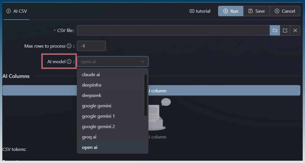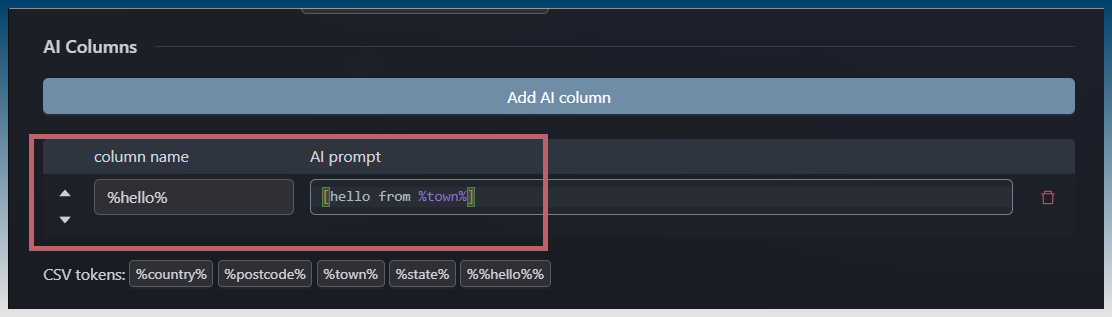 - Enter column name and AI prompt using %tokens% from CSV headers.