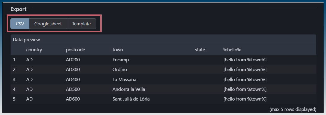 - Choose export format: CSV file, Google Sheet, or template-based files.