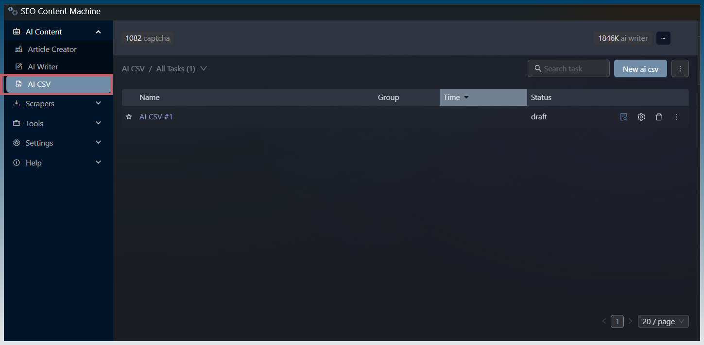 The AI CSV tool automates bulk content generation by using CSV rows as variables in AI prompts.