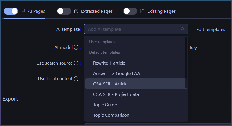 Scraped article generator has options to use templates to create things like GSA SER project files