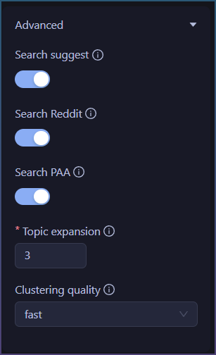 | Clustering quality | Embedding dimension used for semantic clustering. Lower dimensions are faster but less accurate. Balanced is recommended for most SEO clustering tasks |