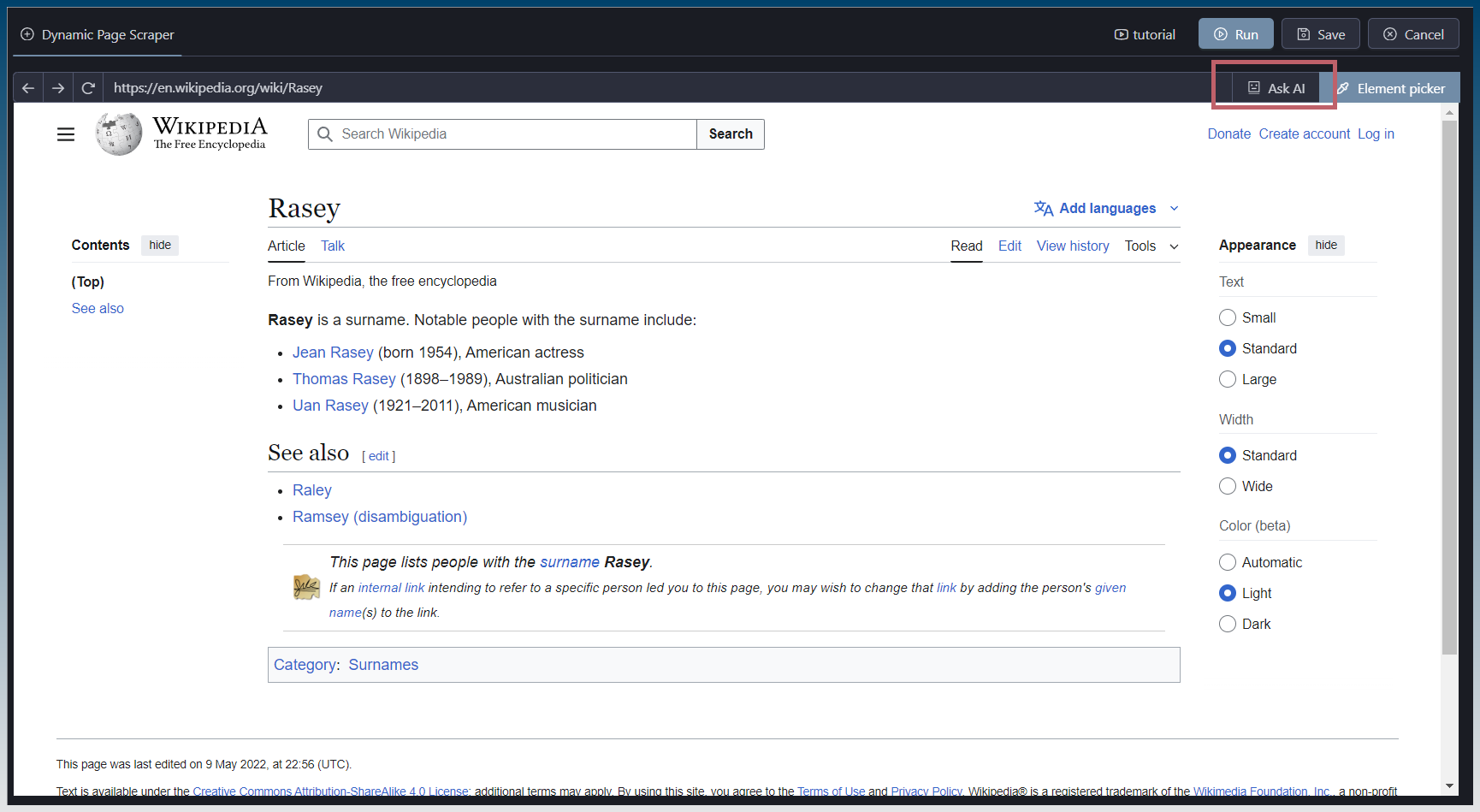 With dynamic page I use the picker to select the text to find the selector but sometimes It won’t find the correct selector no matter what I do so I’ve copied and pasted the source code of the page into chat gbt and asked it to find the css selector for the text I wanted to scrape then copy and paste it into the dynamic page selector field and works.